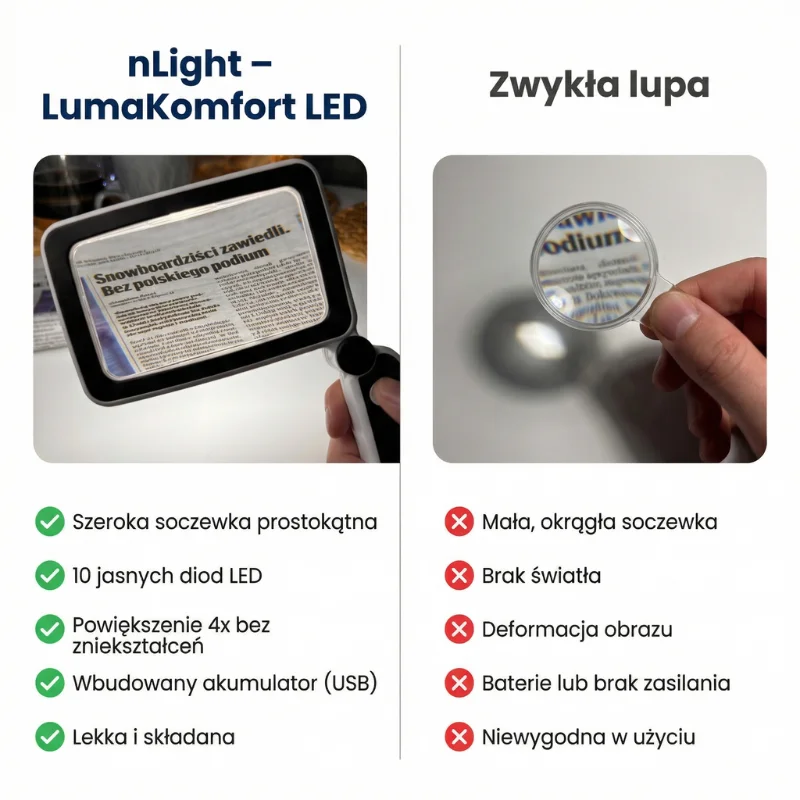 Na początku podchodziłam sceptycznie — myślałam, że to kolejna lupa z reklam, która nic nie zmienia. Ale ku mojemu zaskoczeniu, naprawdę widzę dużo lepiej i nie męczę już oczu przy czytaniu ulotek czy książki. Światło LED jest bardzo przyjemne, nic nie razi i mogę spokojnie czytać wieczorem. Teraz mam ją zawsze przy sobie i czuję się dużo pewniej — nie muszę nikogo prosić o pomoc.