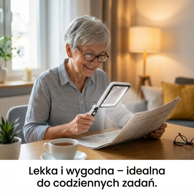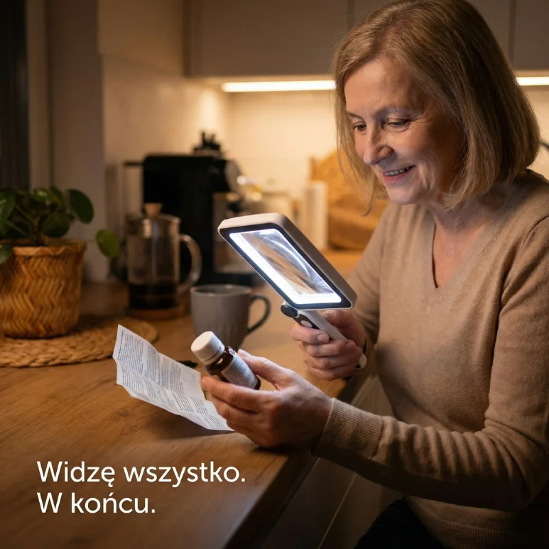 Zaczęło się od tego, że nie mogłam przeczytać składu na etykietach w sklepie — wszystko zlewało mi się w plamę. Bałam się, że ta lupa to jakaś chińska zabawka, ale wykonanie jest porządne, światło mocne i równomierne. Nie jestem „techniczna”, a mimo to obsługa jest banalnie prosta — wystarczy rozłożyć i gotowe. Dla mnie to duża ulga, bo czuję, że nadal mam kontrolę nad codziennymi sprawami.
